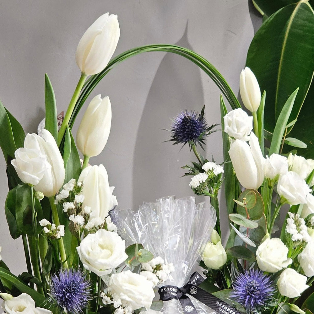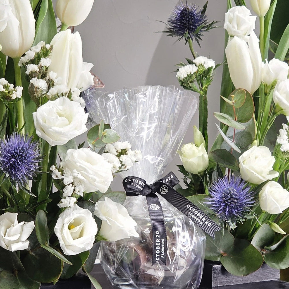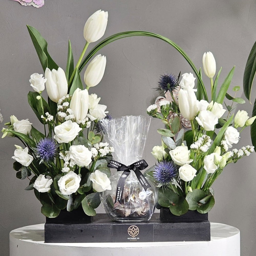 This elegant arrangement includes fresh white tulips, white lisianthus, baby’s breath, statice flowers, and blue thistle, with green eucalyptus leaves. In the center, there’s a wrapped box of Belgian chocolate tied with a black ribbon – perfect for a classy and thoughtful gift.