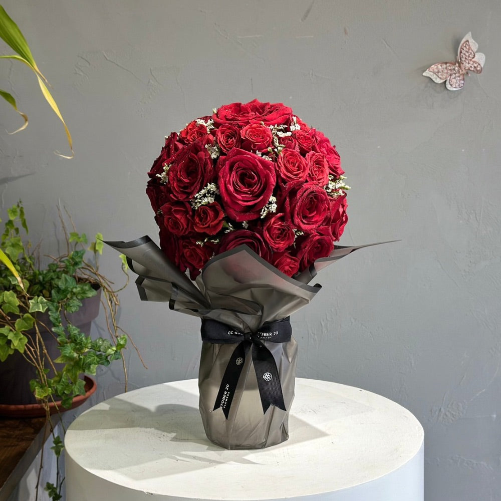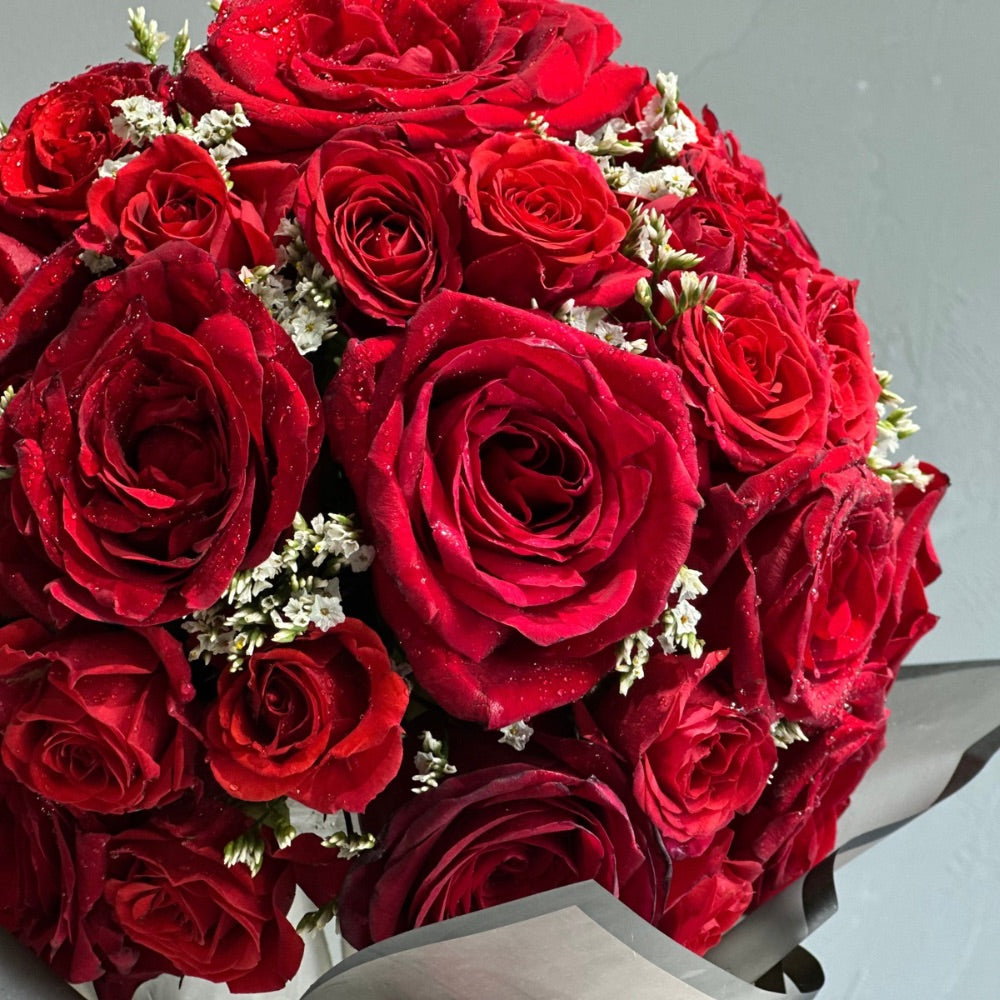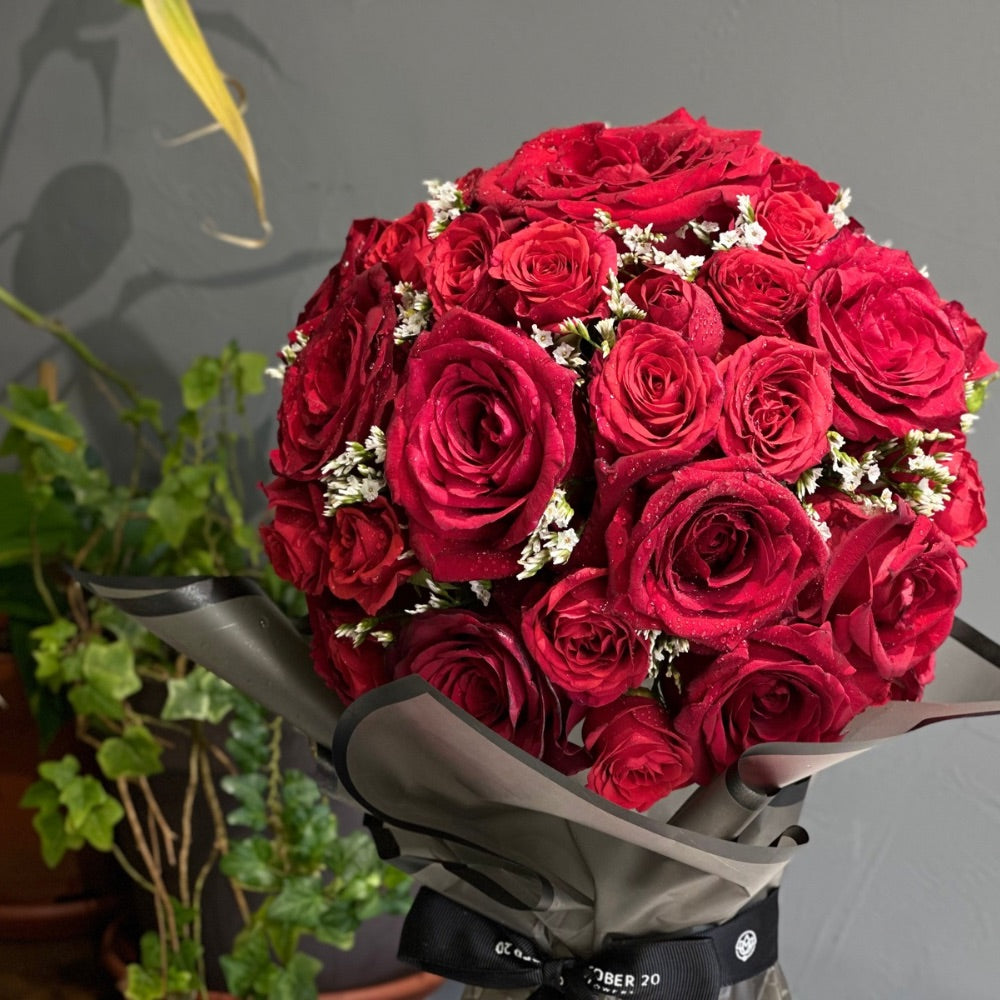 A glass vase arrangement of fresh red roses and baby roses with eucalyptus and limonium.
