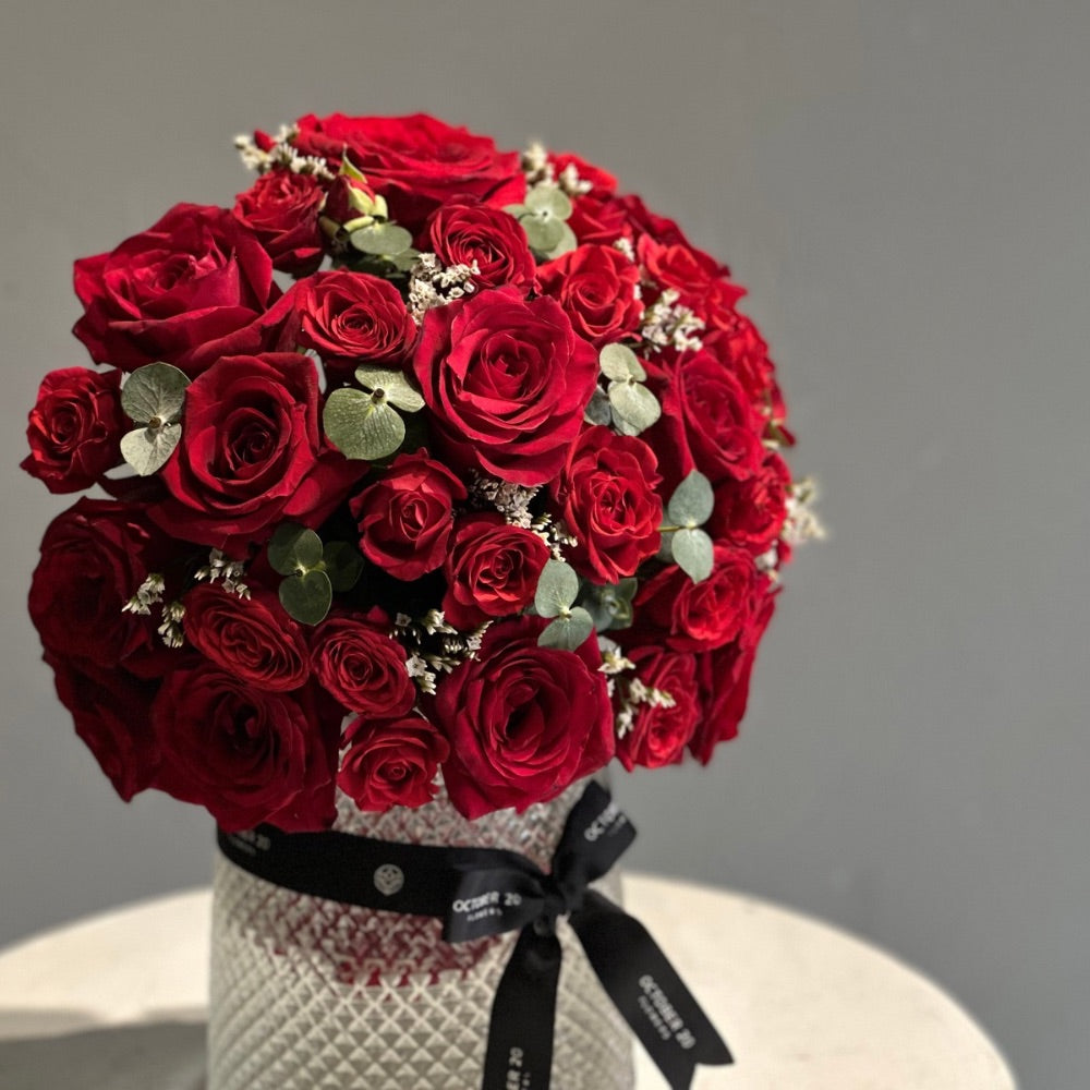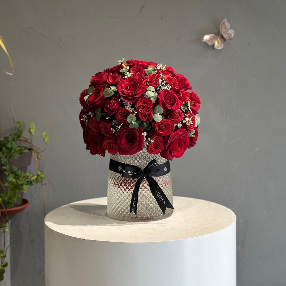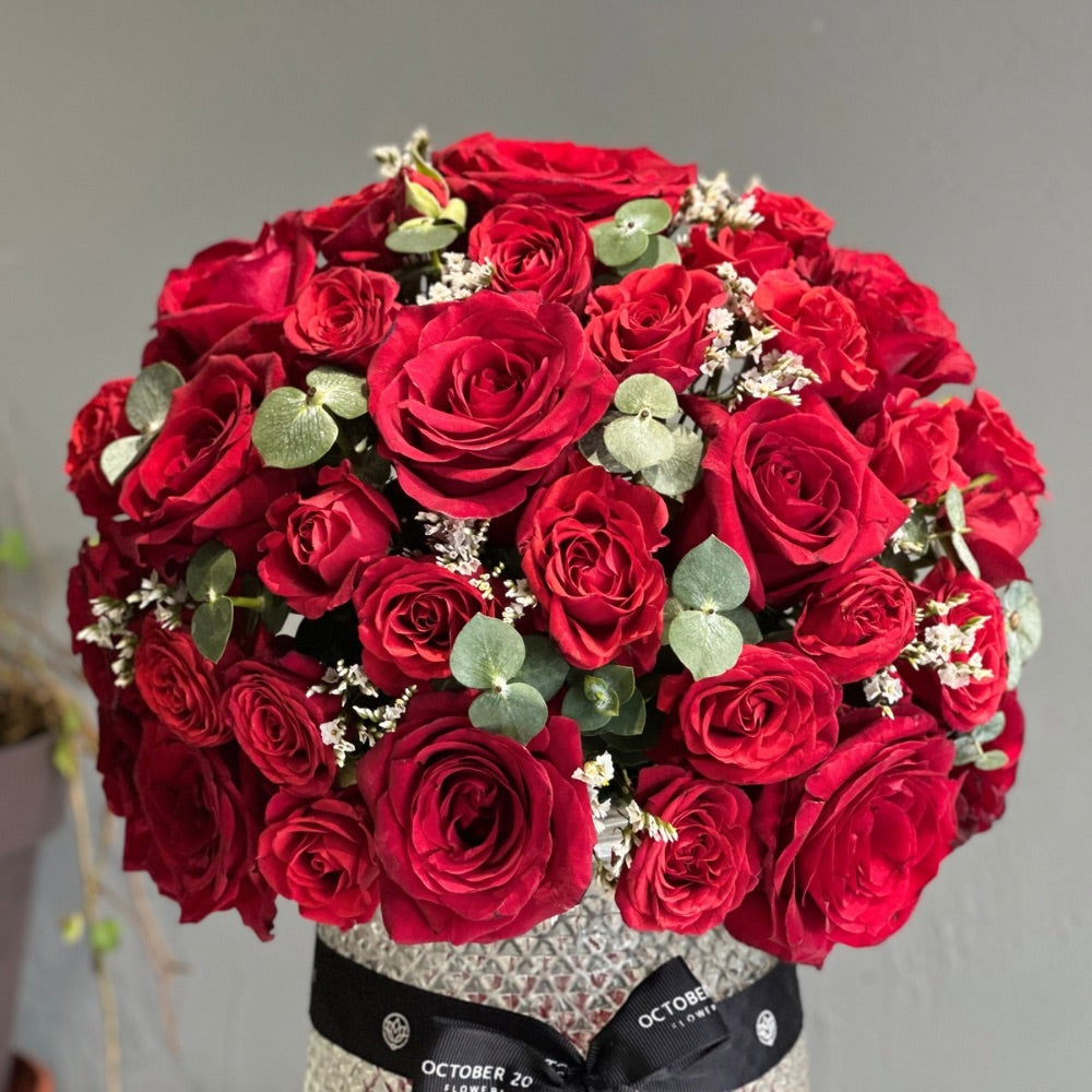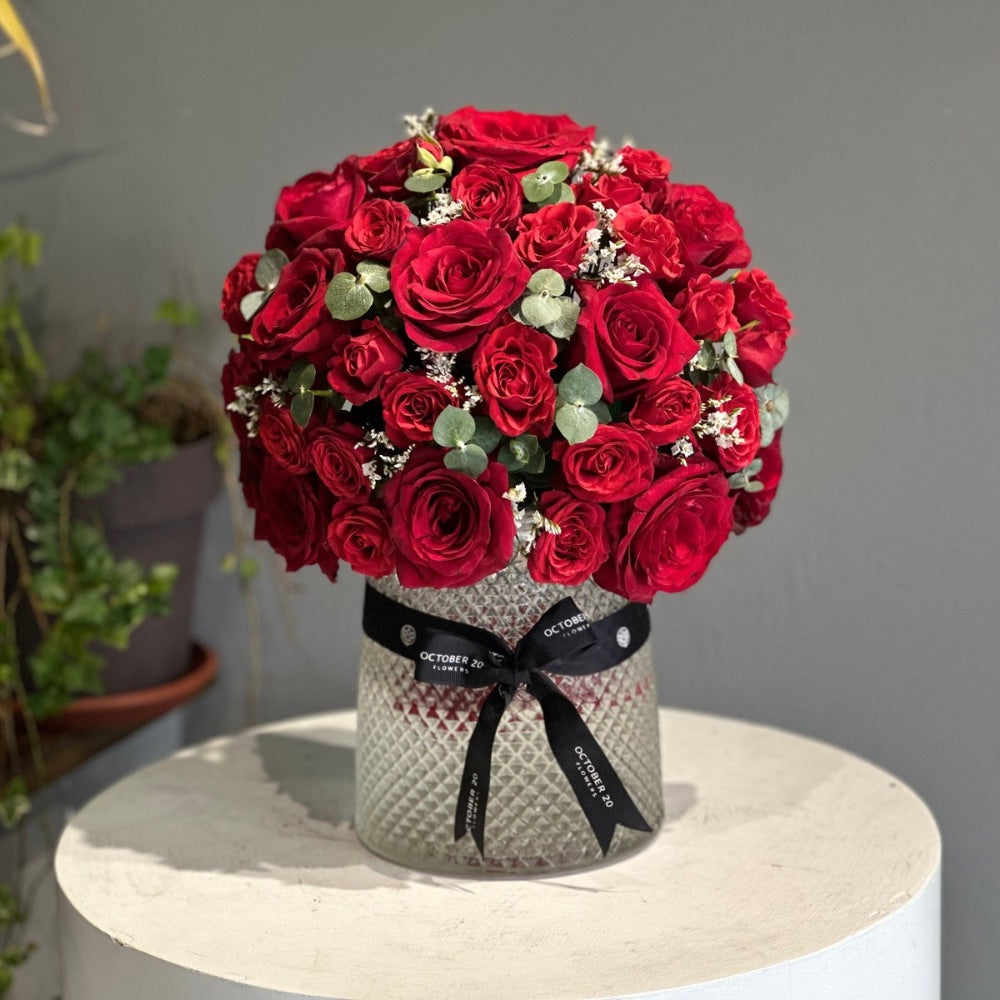 A glass vase arrangement of fresh red roses with eucalyptus and limonium.