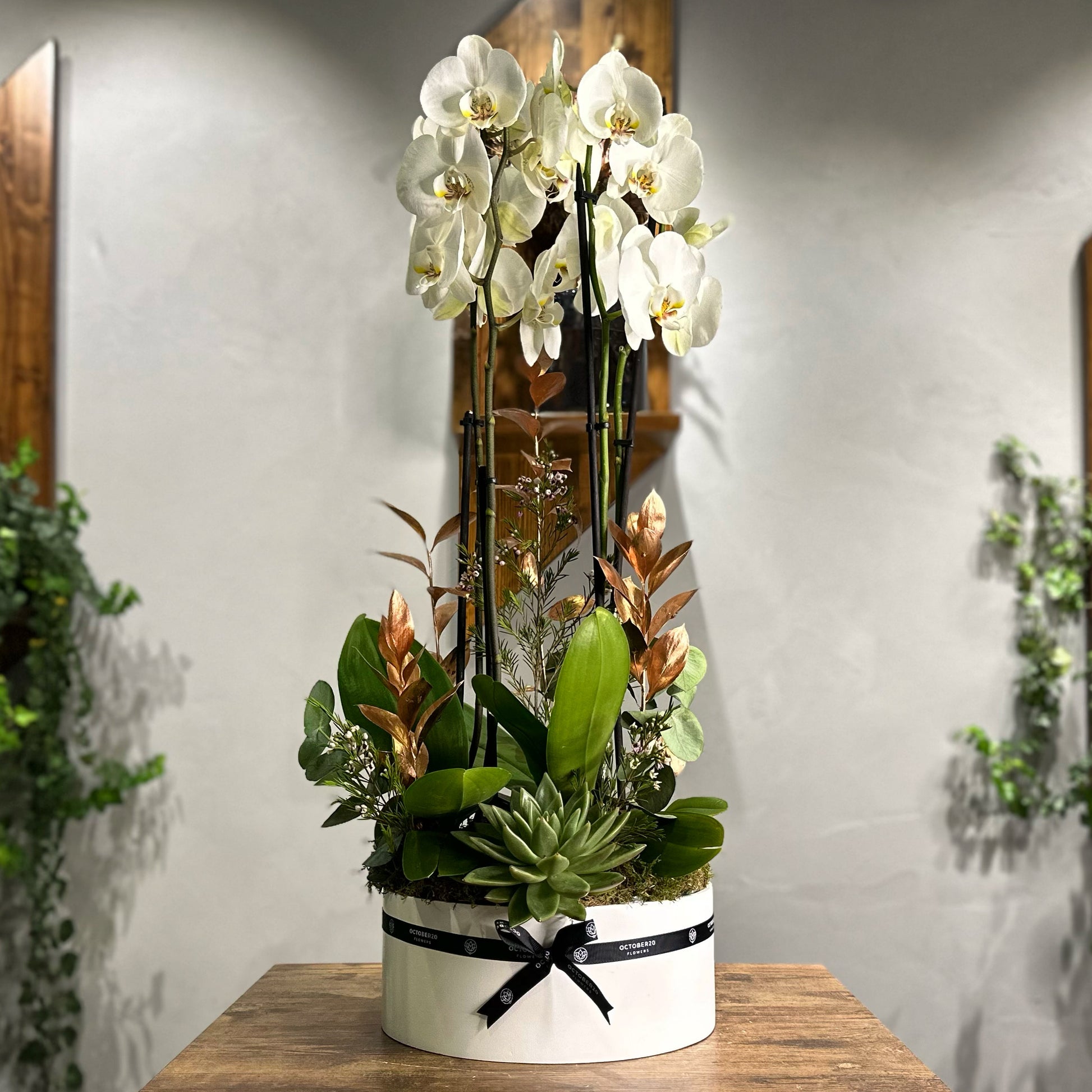 This bouquet in a round wooden vase contains orchids, eucalyptus, flat moss and succulent.