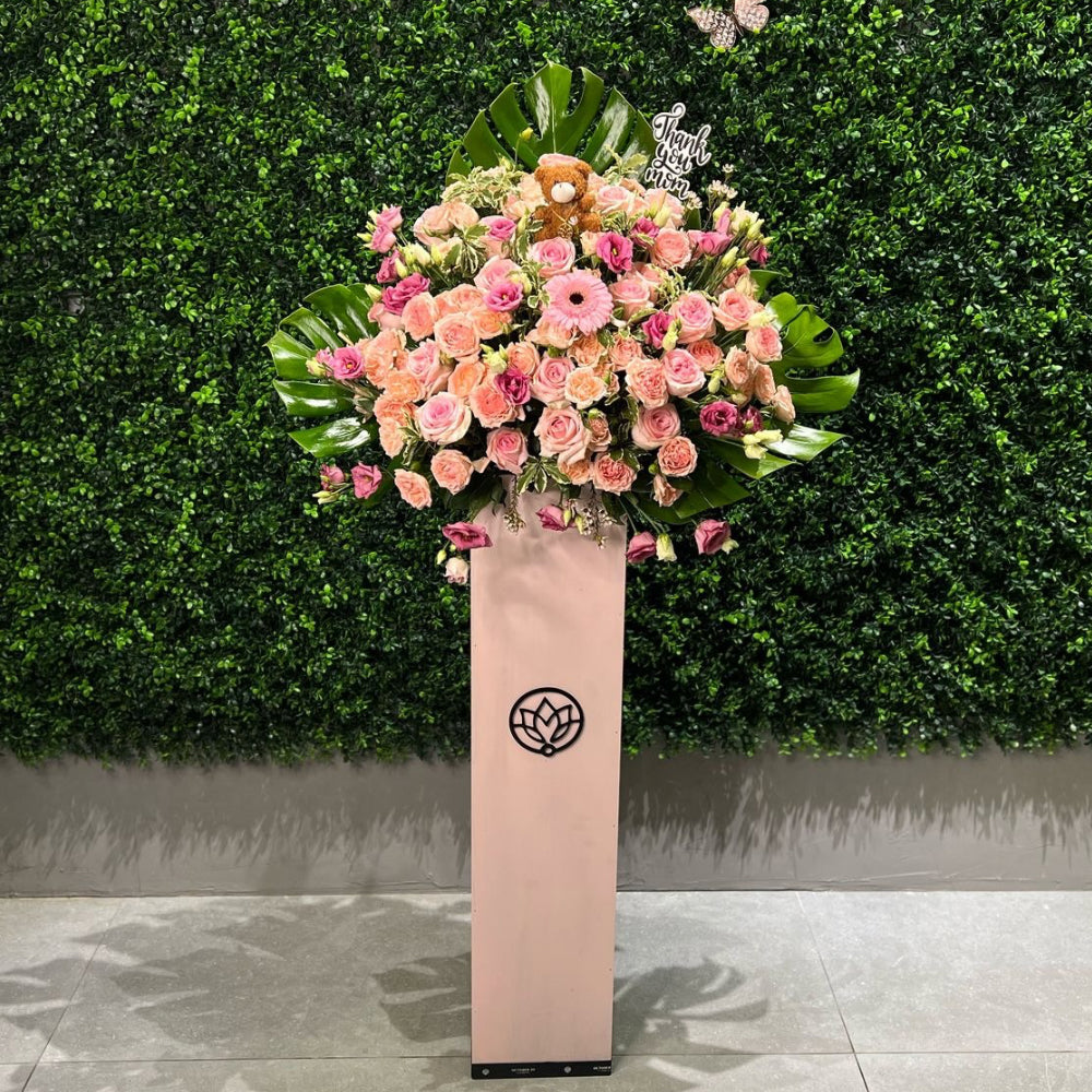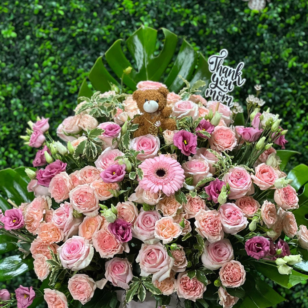 A wooden black stand with a flower arrangement of roses and baby roses, along with a Teddy bear that contains a preserved rose and an 18k gold chain.