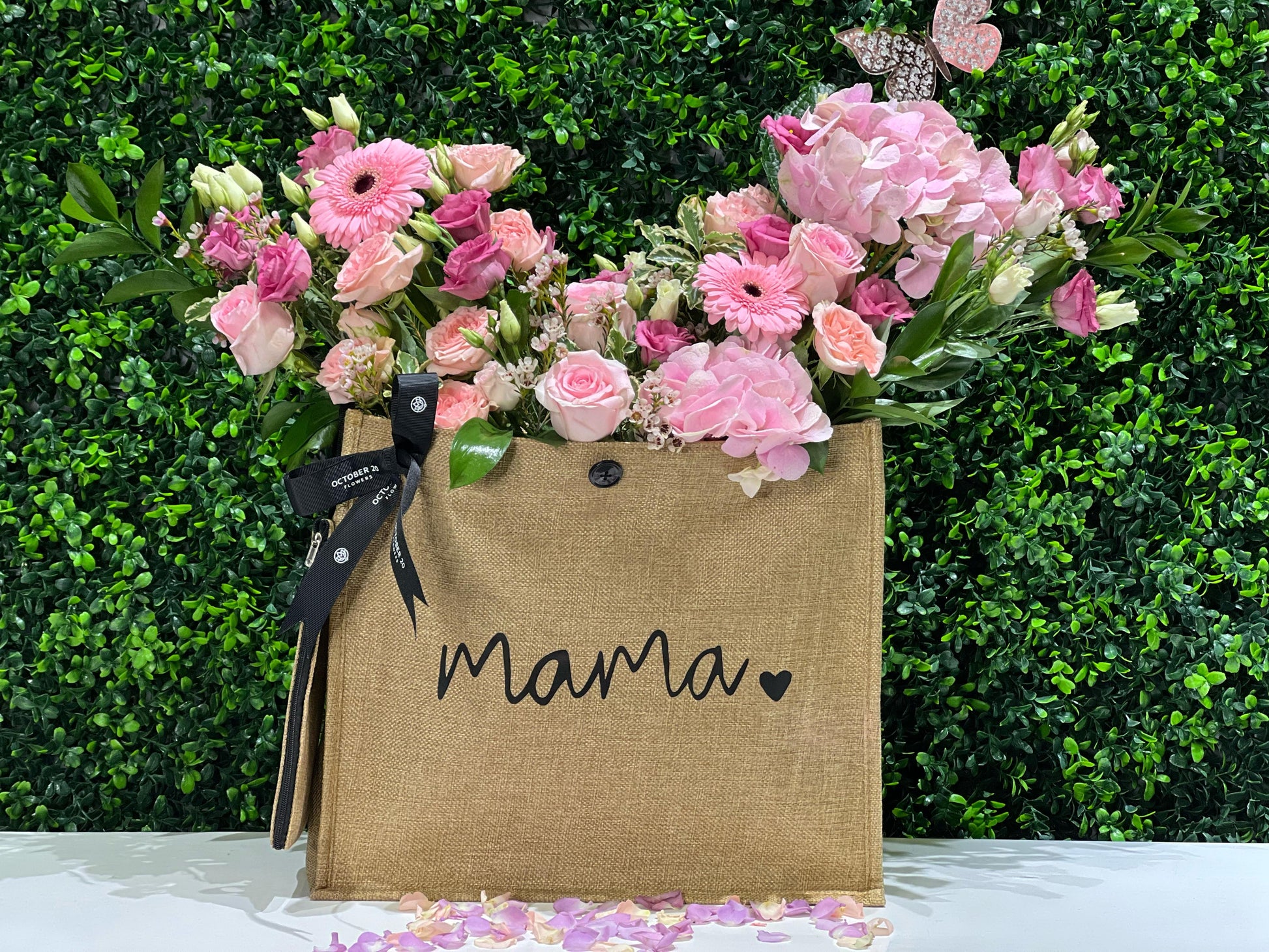 Our Mama Bag & pouch designed with fresh flower arrangement of roses, baby roses, wax, hydrangea, Gerbera and ruscus.