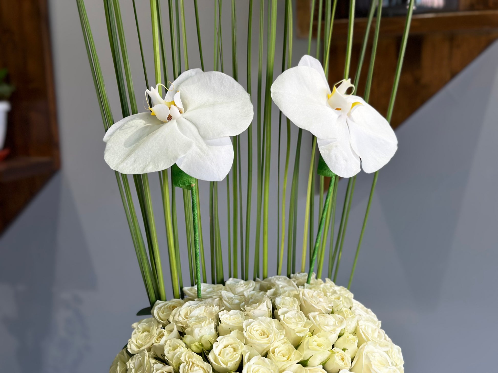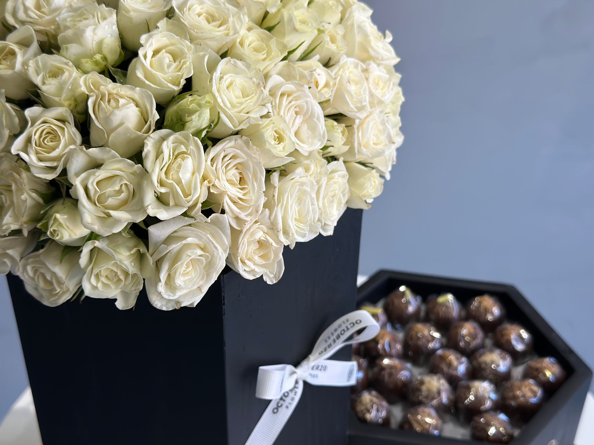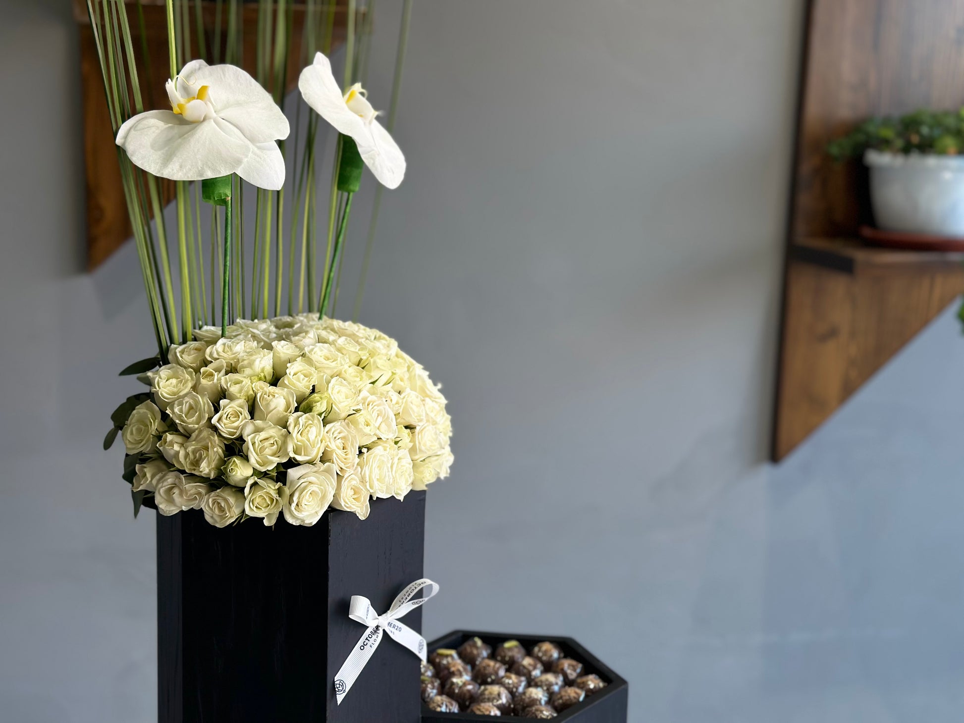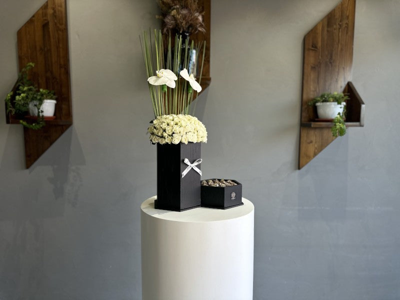 This wooden vase contains baby roses and orchid cut flowers with eucalyptus and steel grass, comes with chocolates.