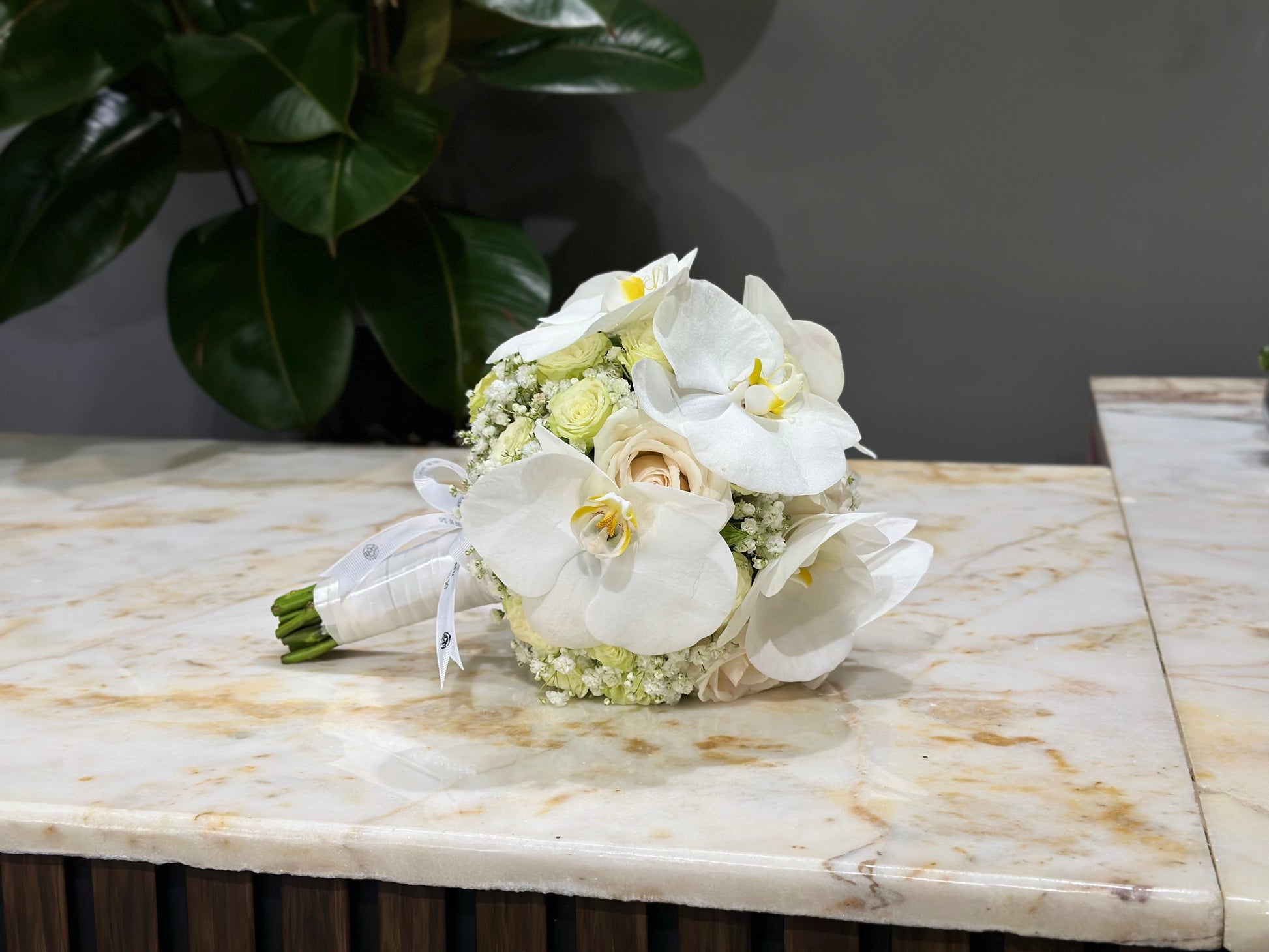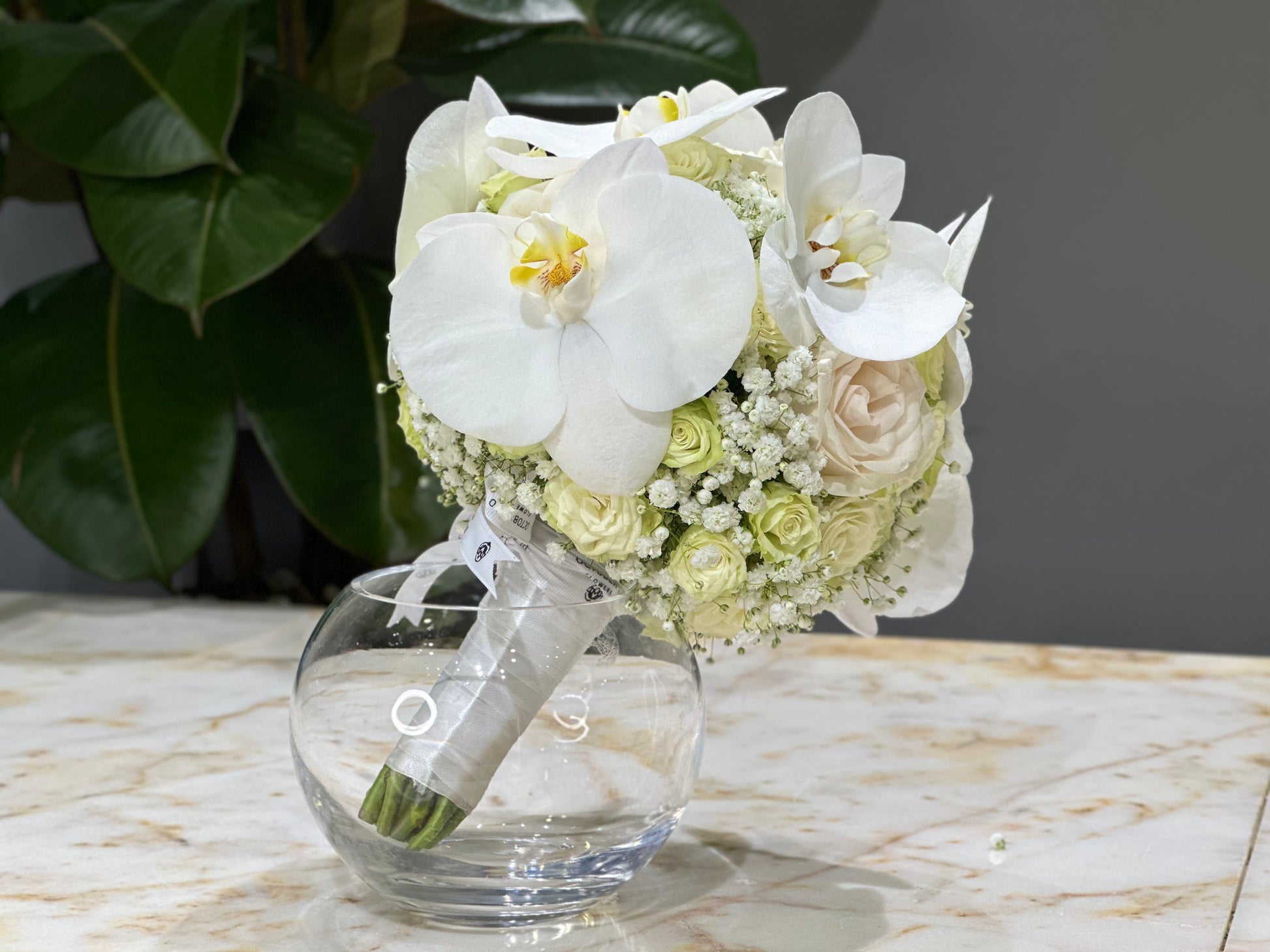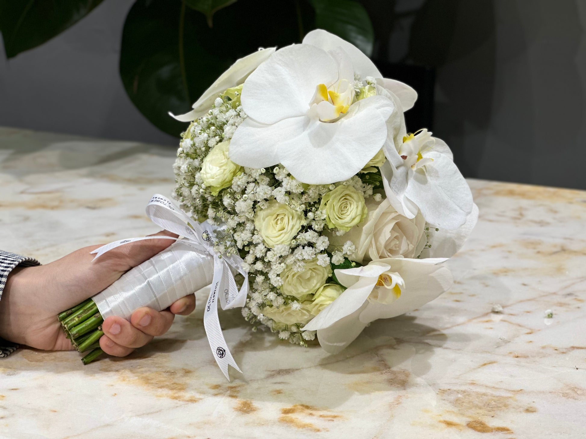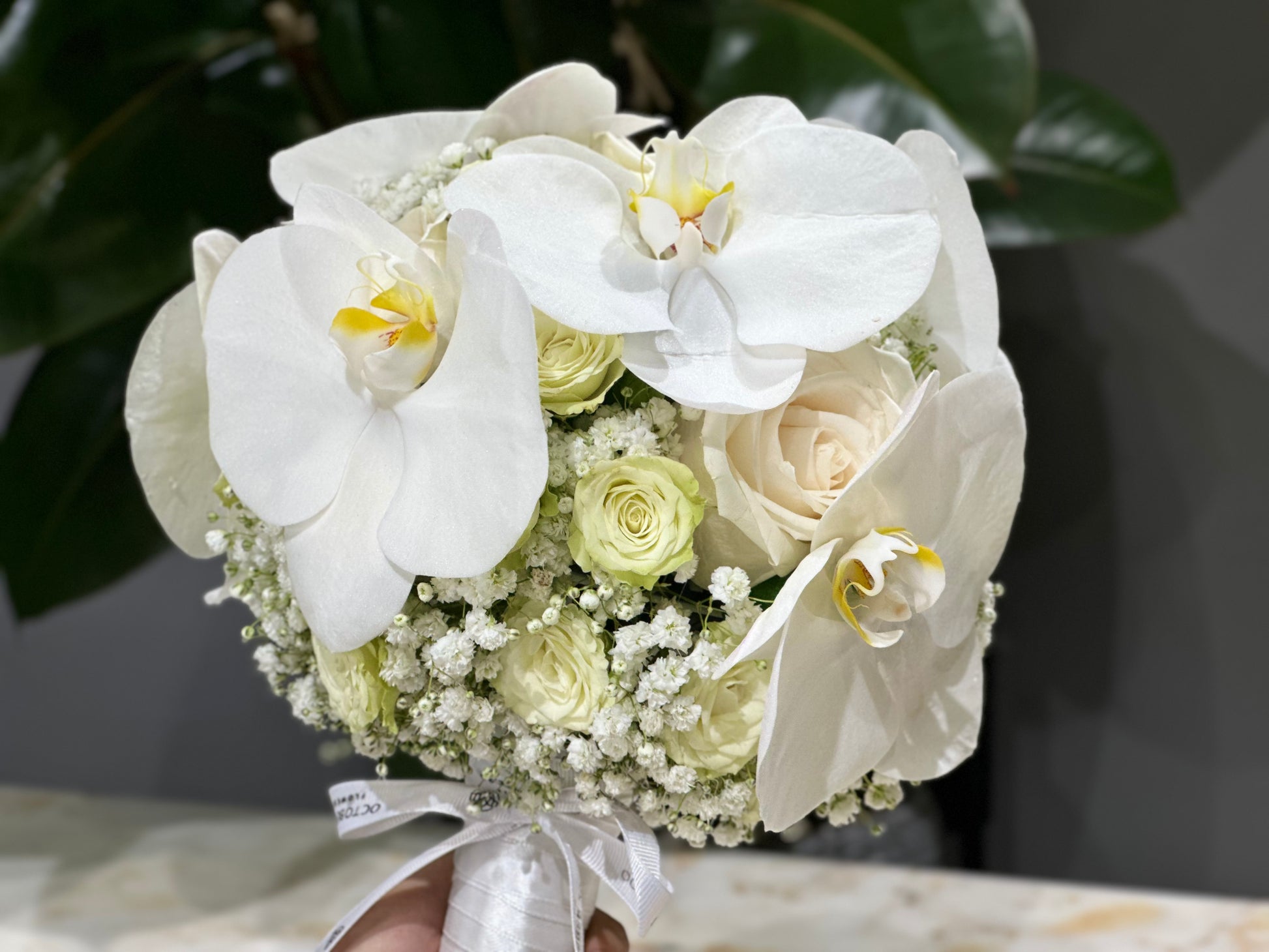 This maska contains roses, baby roses, gypsophilia and philanopsis.