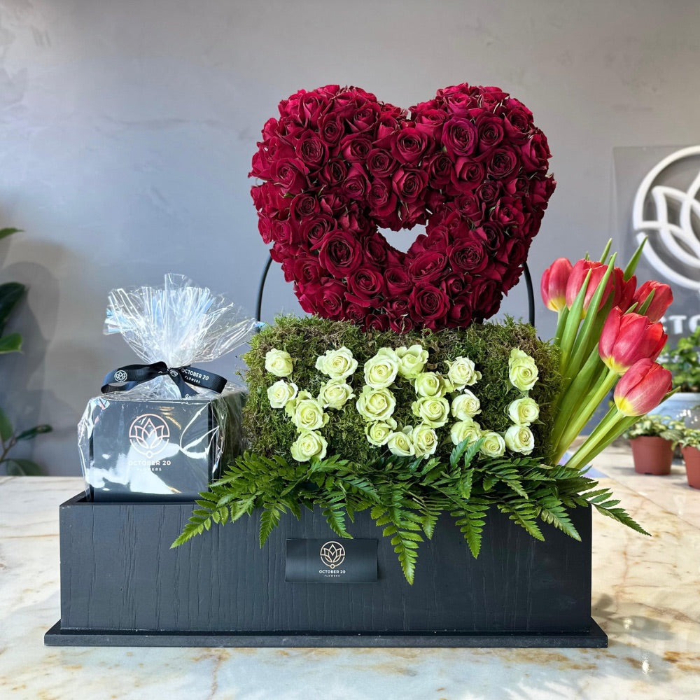 A wooden box that contains baby rose and tulip flowers with Belgian chocolates in 4 flavors.