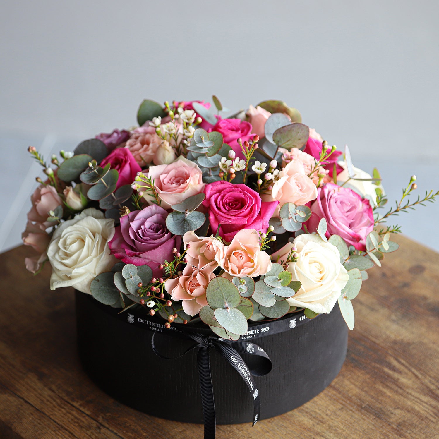 the bouquet contains a wooden round box, with white, fuchsia, purple big roses, sweet Sarah, wax white, and eucalyptus