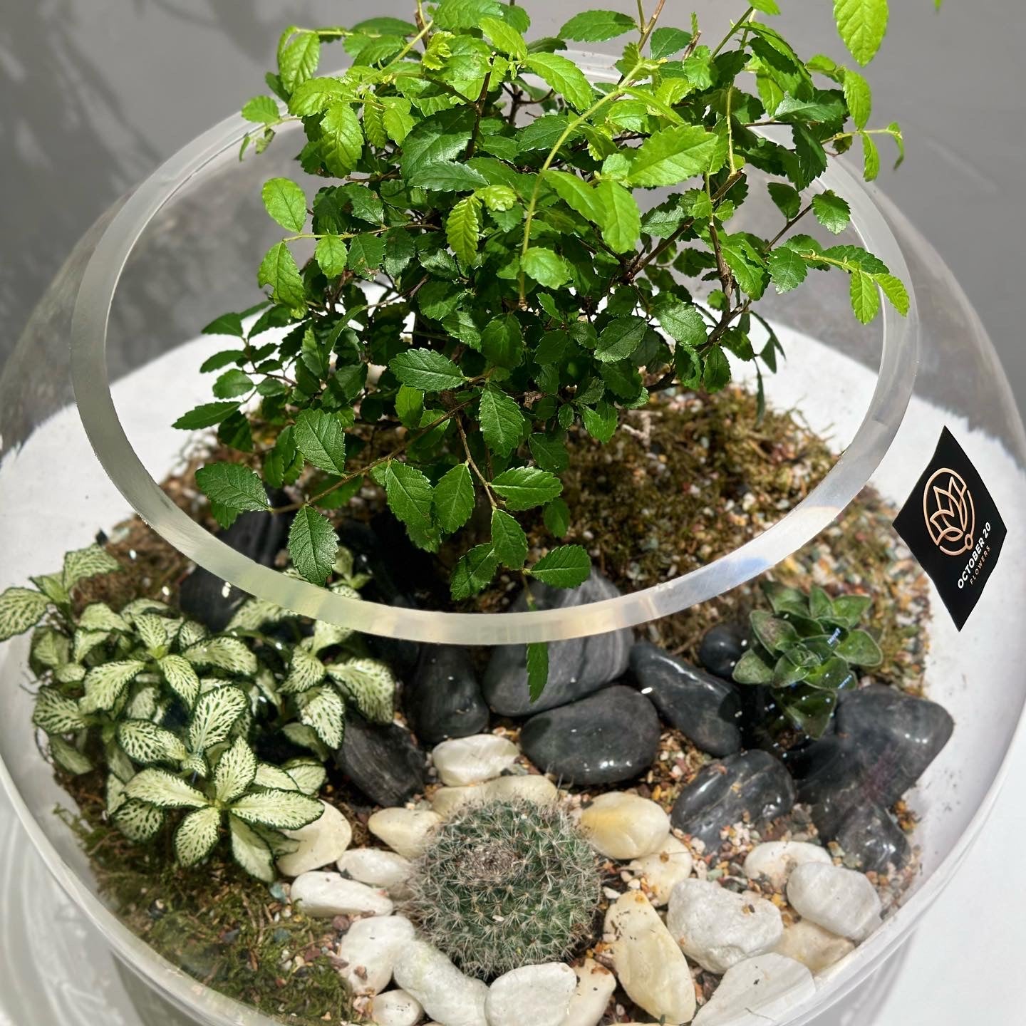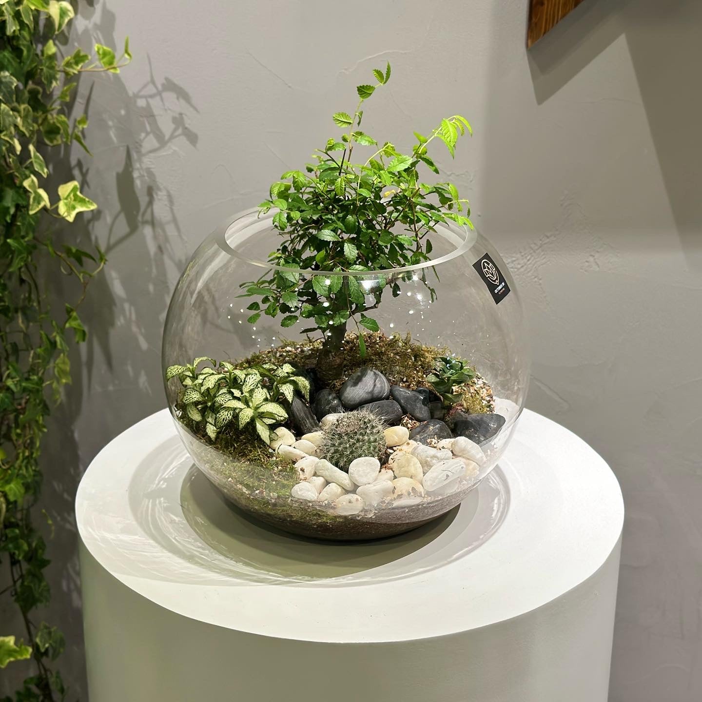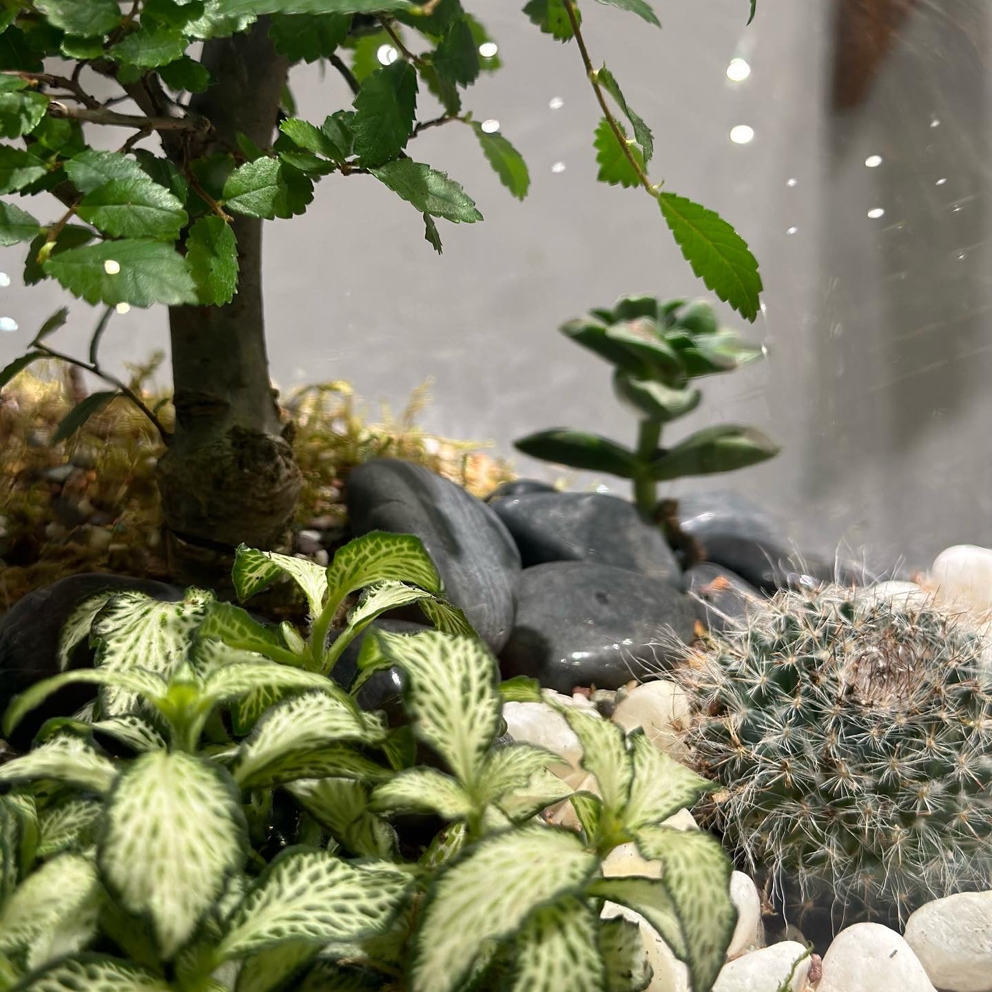 This terrarium contains a glass bowl with bonsai, cactus, black stone, white stone, moss and soil.