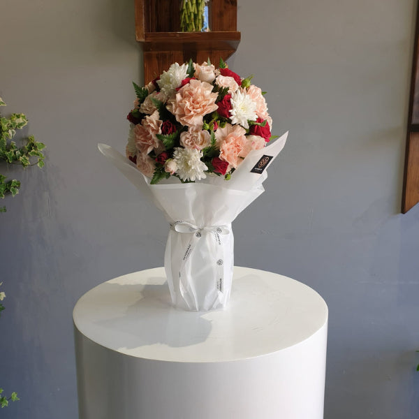 This bouquet contains a round glass vase with roses, baby rose, carnation, crysenthemum and leather leaf.