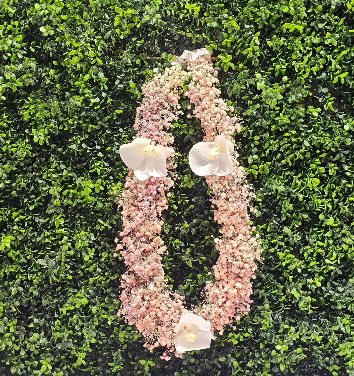 Soft pink baby’s breath with white orchids, crafted into a graceful flower lei. Elegant and perfect for any occasion.
