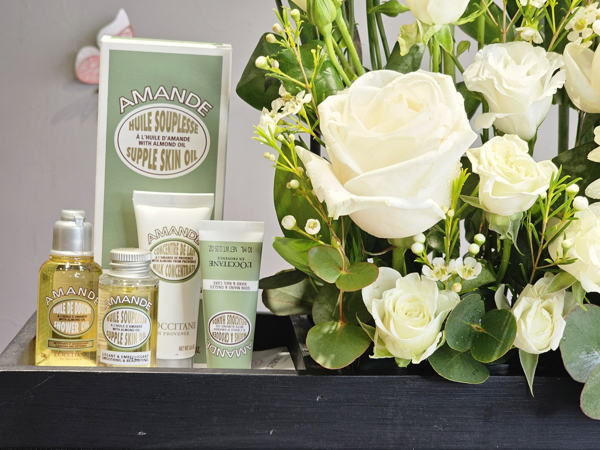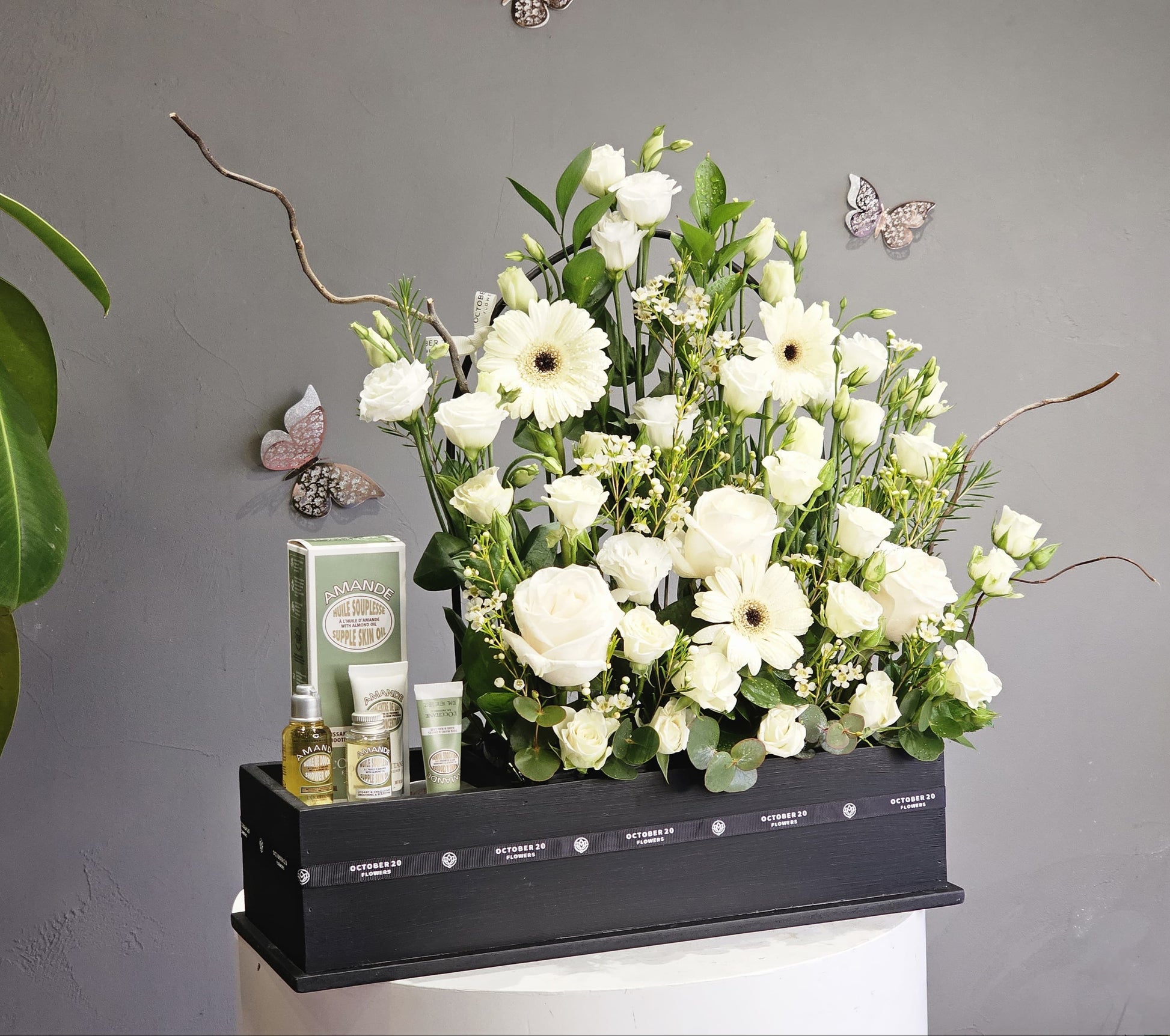This elegant arrangement features white lisianthus, gerbera, baby roses, and classic white roses, complemented by ruscus & gums, delicate wax flowers, and a touch of dried salix. Paired with a luxurious L’Occitane gift it offers a perfect blend of purity, beauty, and sophistication.
