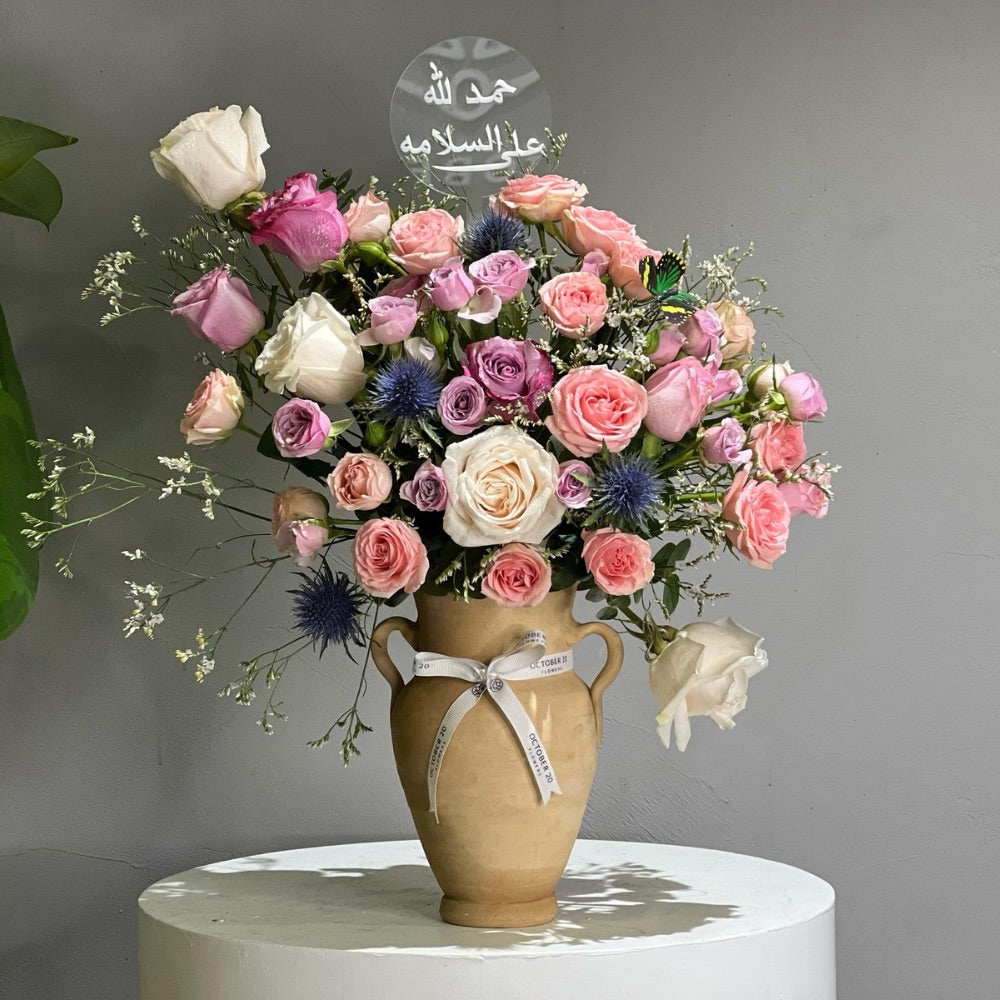 Our beautiful clay pot filled with roses, baby roses and many more in a victorian arrangement.
