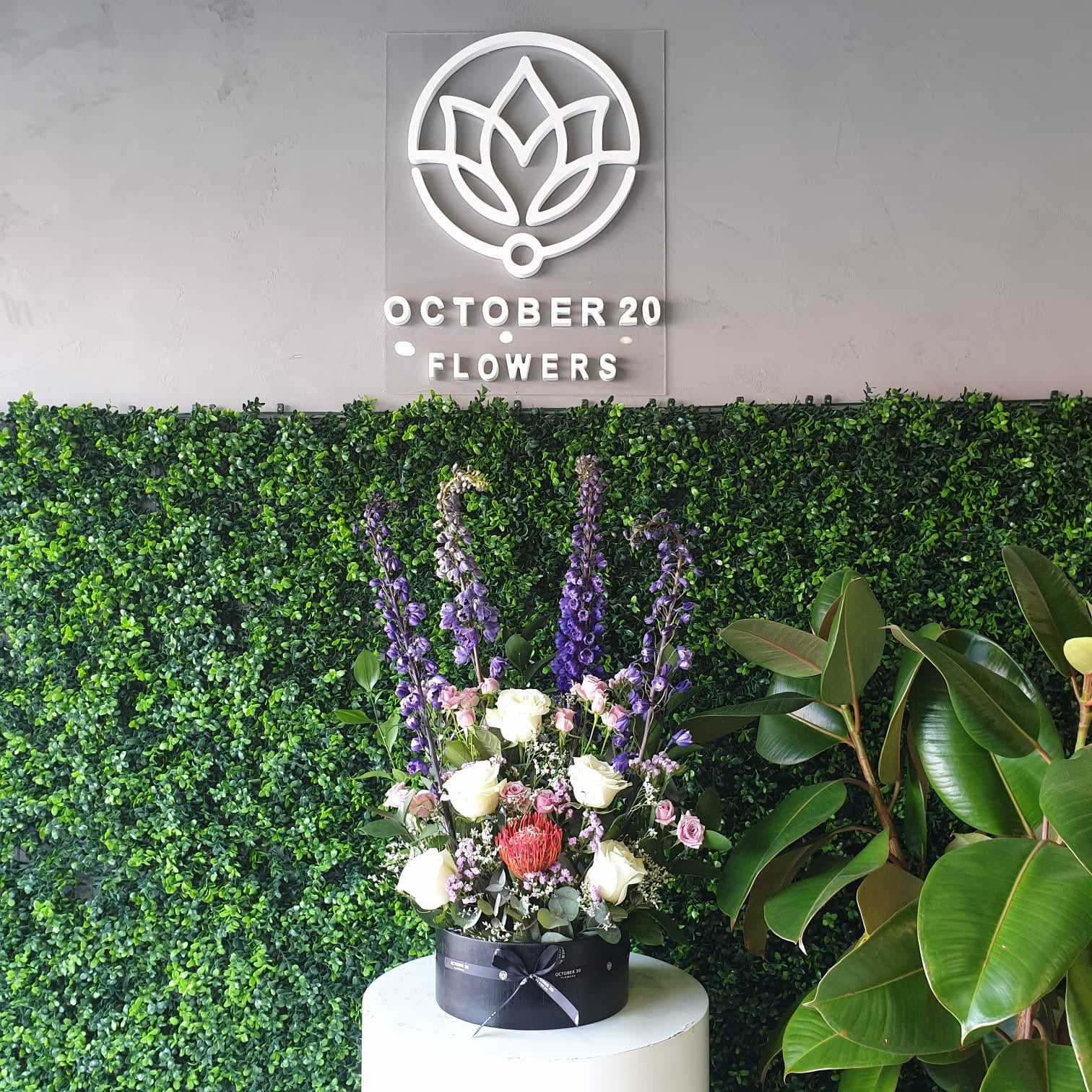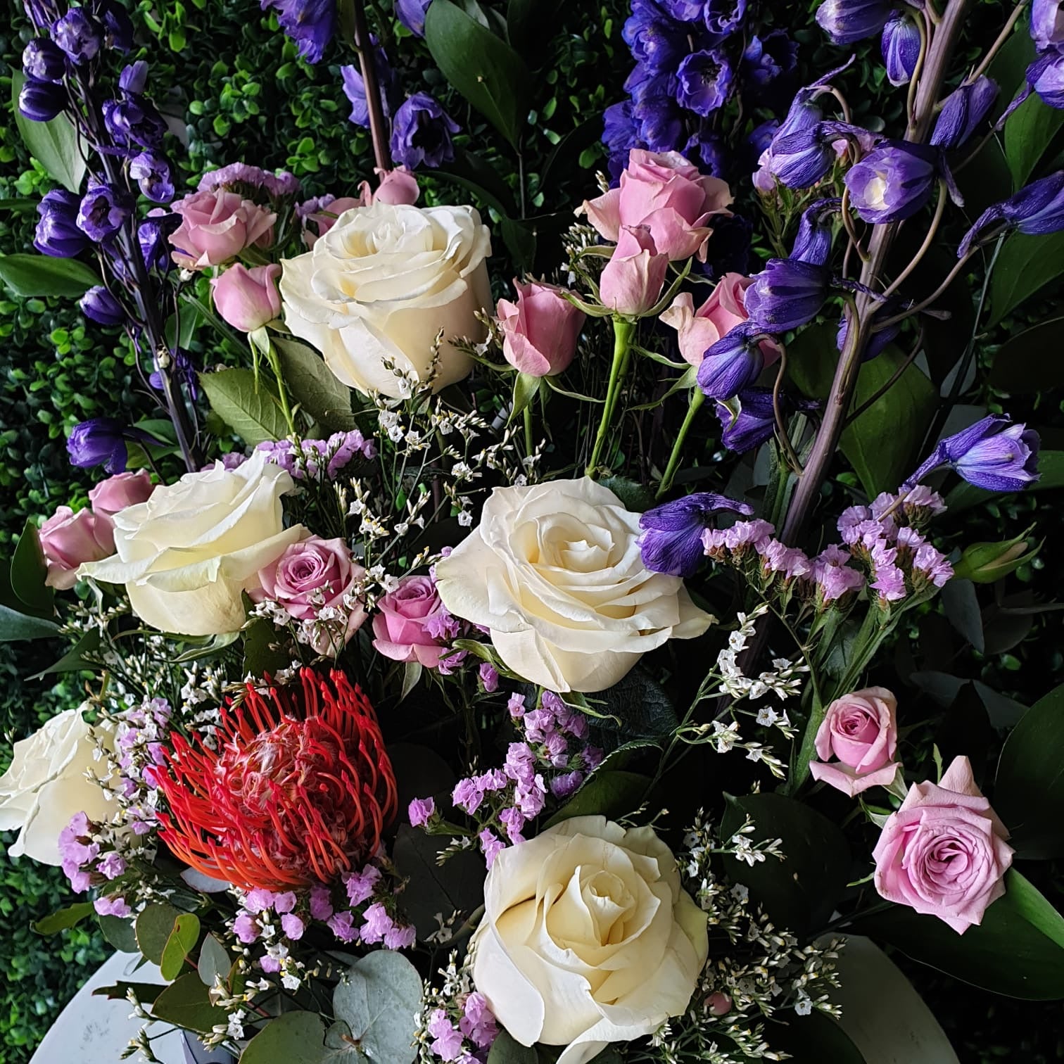 This bouquet contains a black round wooden box with delphinium, protea, roses, baby roses, pubblurium and eucalyptus