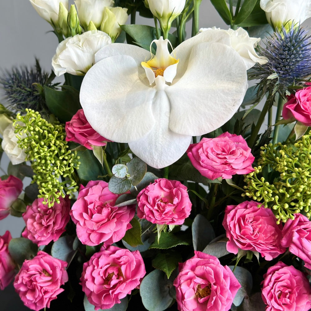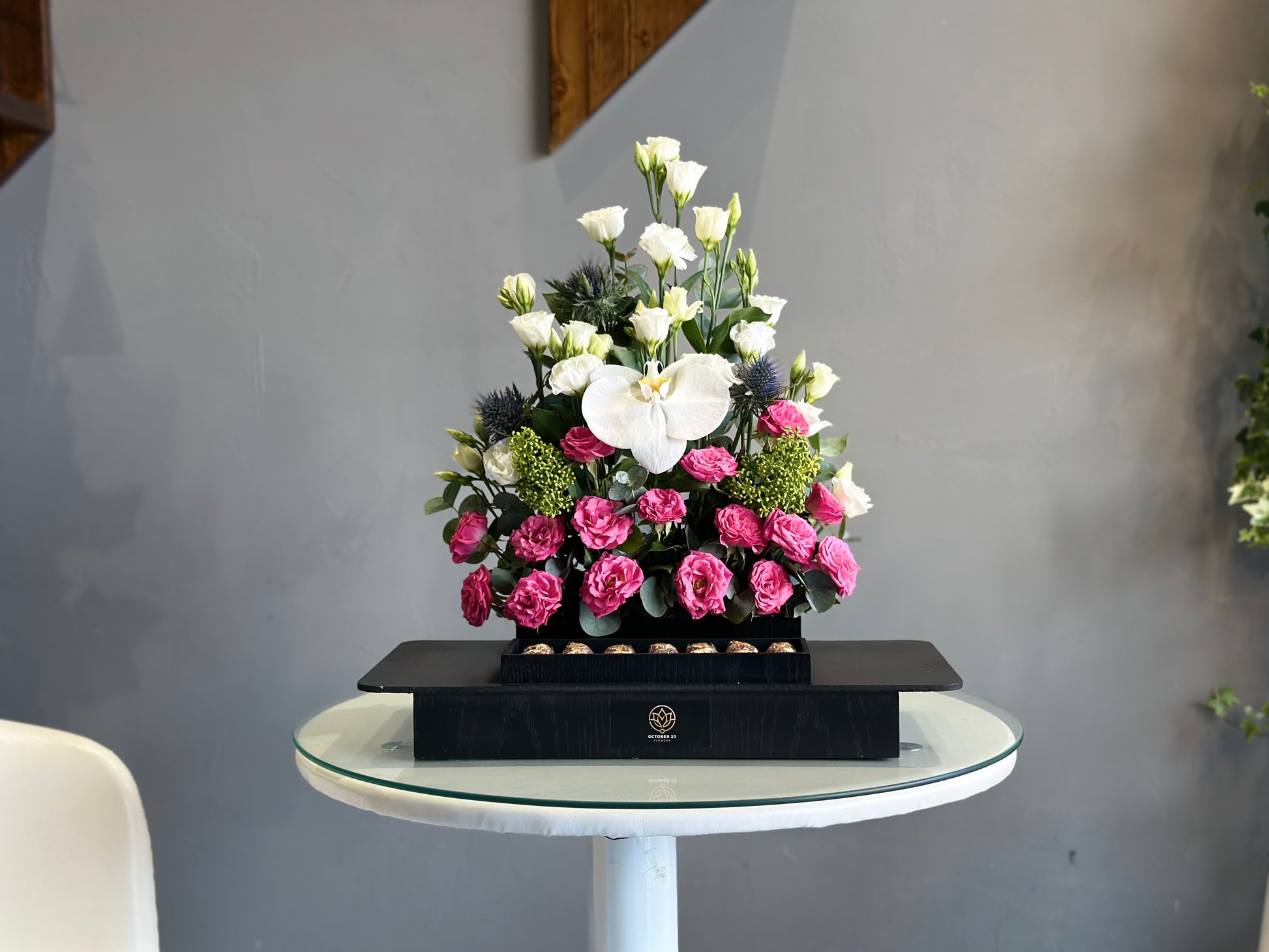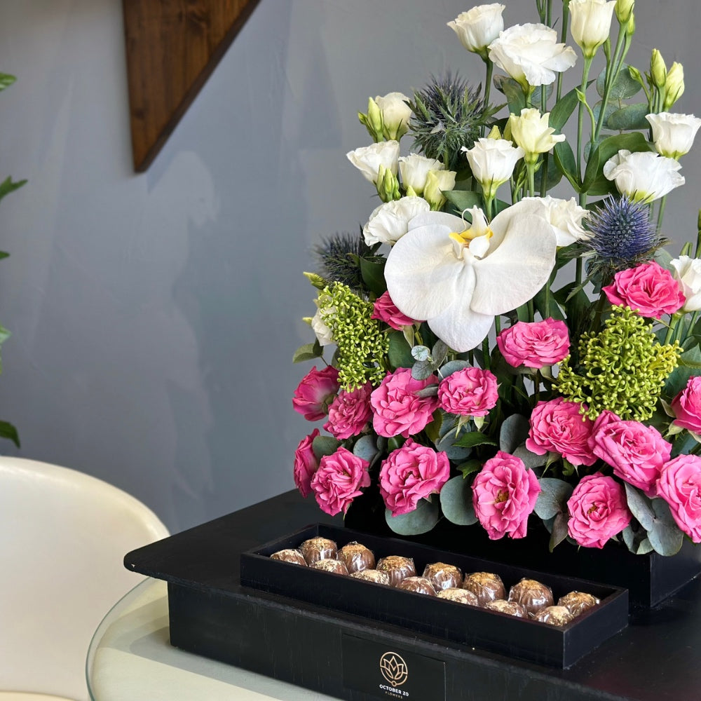 This bouquet contains a black rectangle wooden tray with lisianthus, baby rose, skimmia, orchids, wax, eucalyptus, eryngium and chocolate.