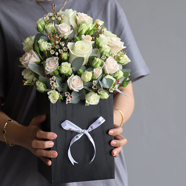 The bouquet contains a black wooded box, big roses, baby roses, eucalyptus, and wax flower.