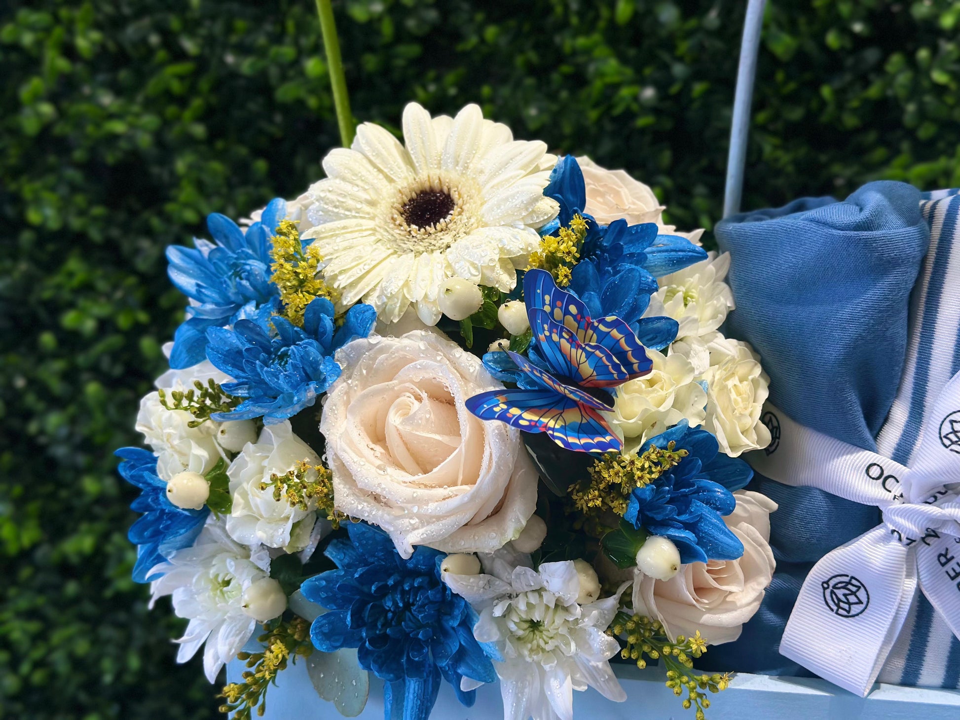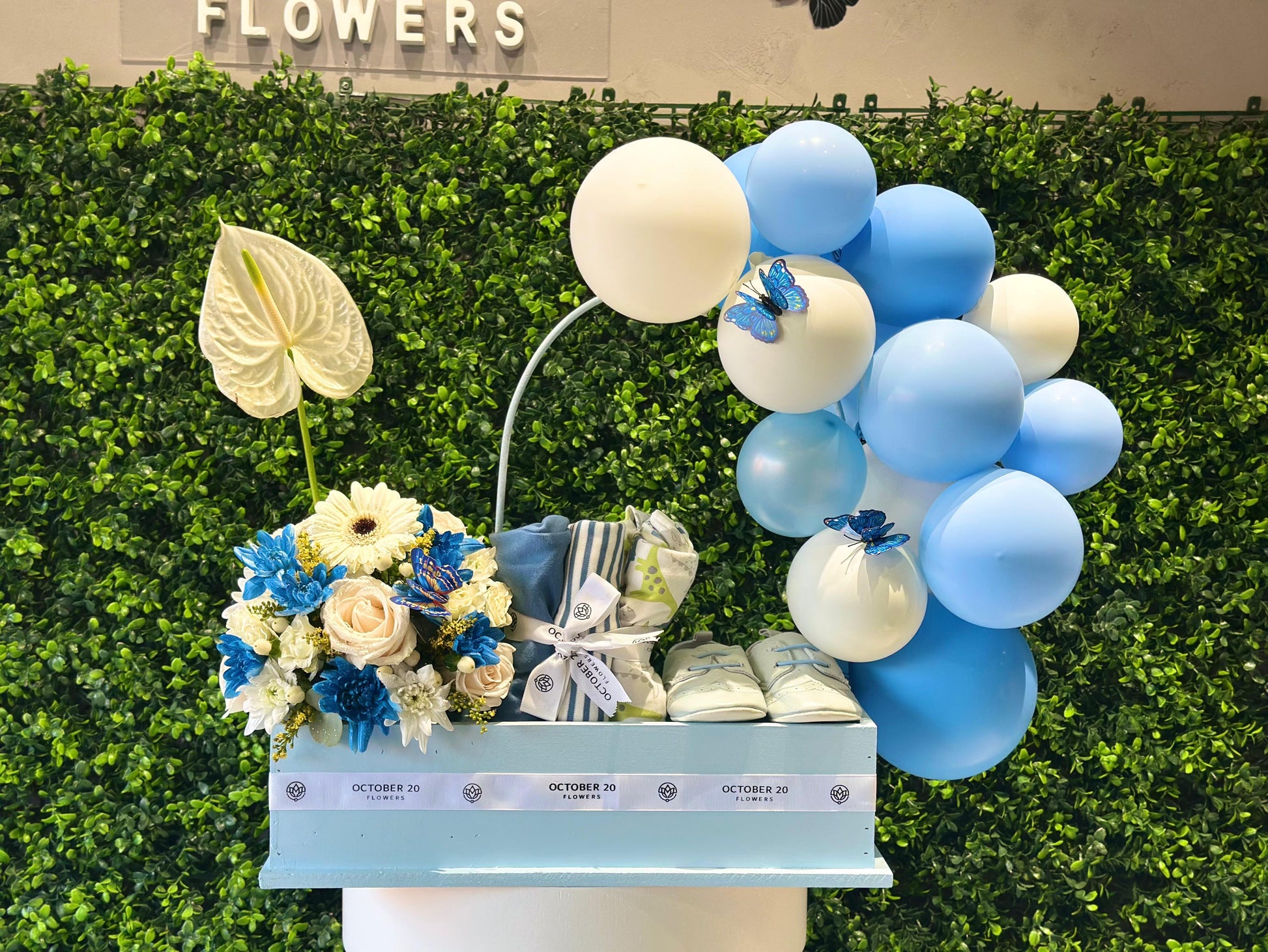 Welcome the newest addition to your family with Sweet Beginnings Blue. This beautifully arranged bouquet features fresh flowers and comes with a unique selection of baby gifts and balloons, perfect for celebrating the arrival of a new baby. A sweet and thoughtful way to show your love and support for the new parents.