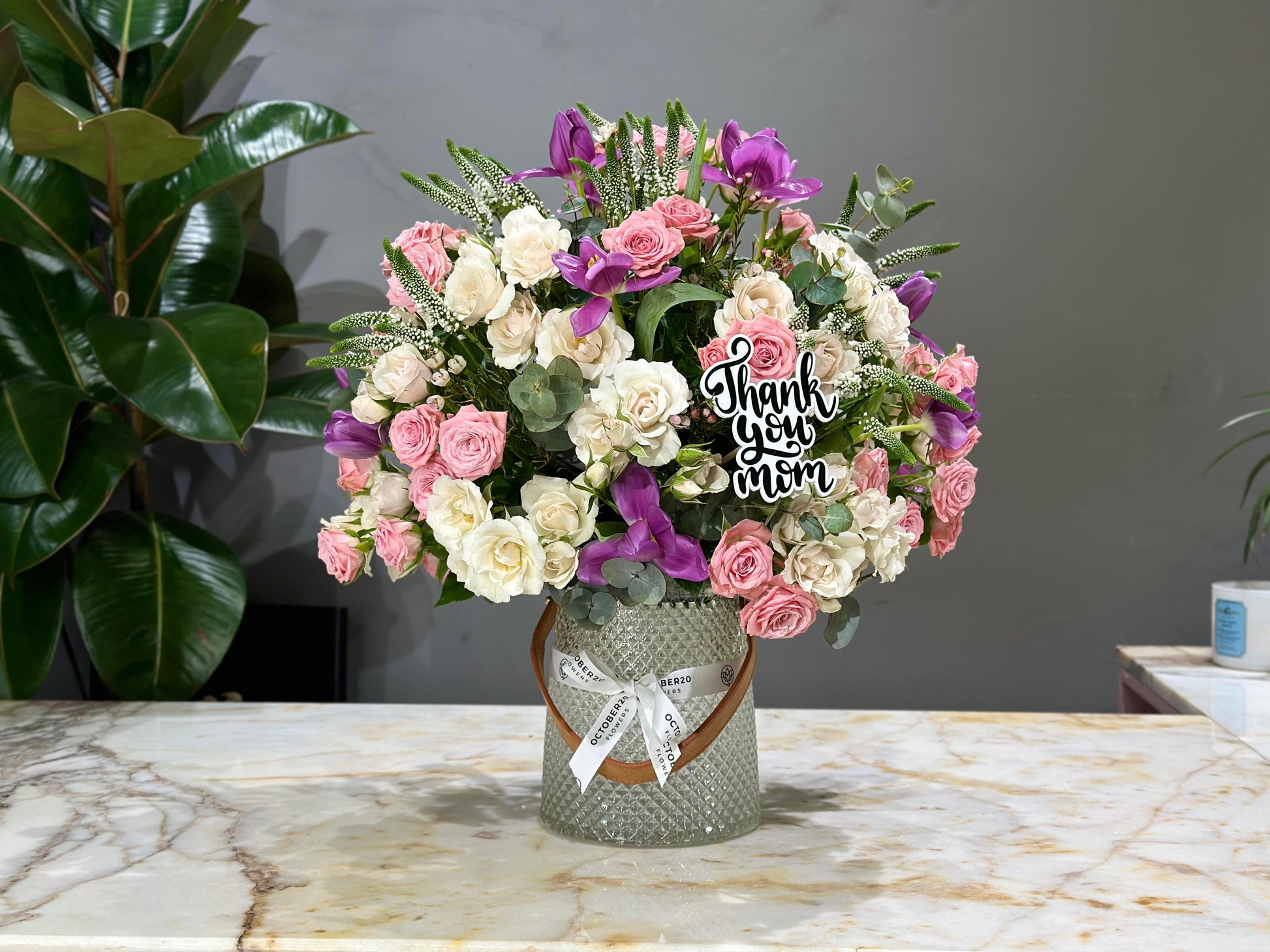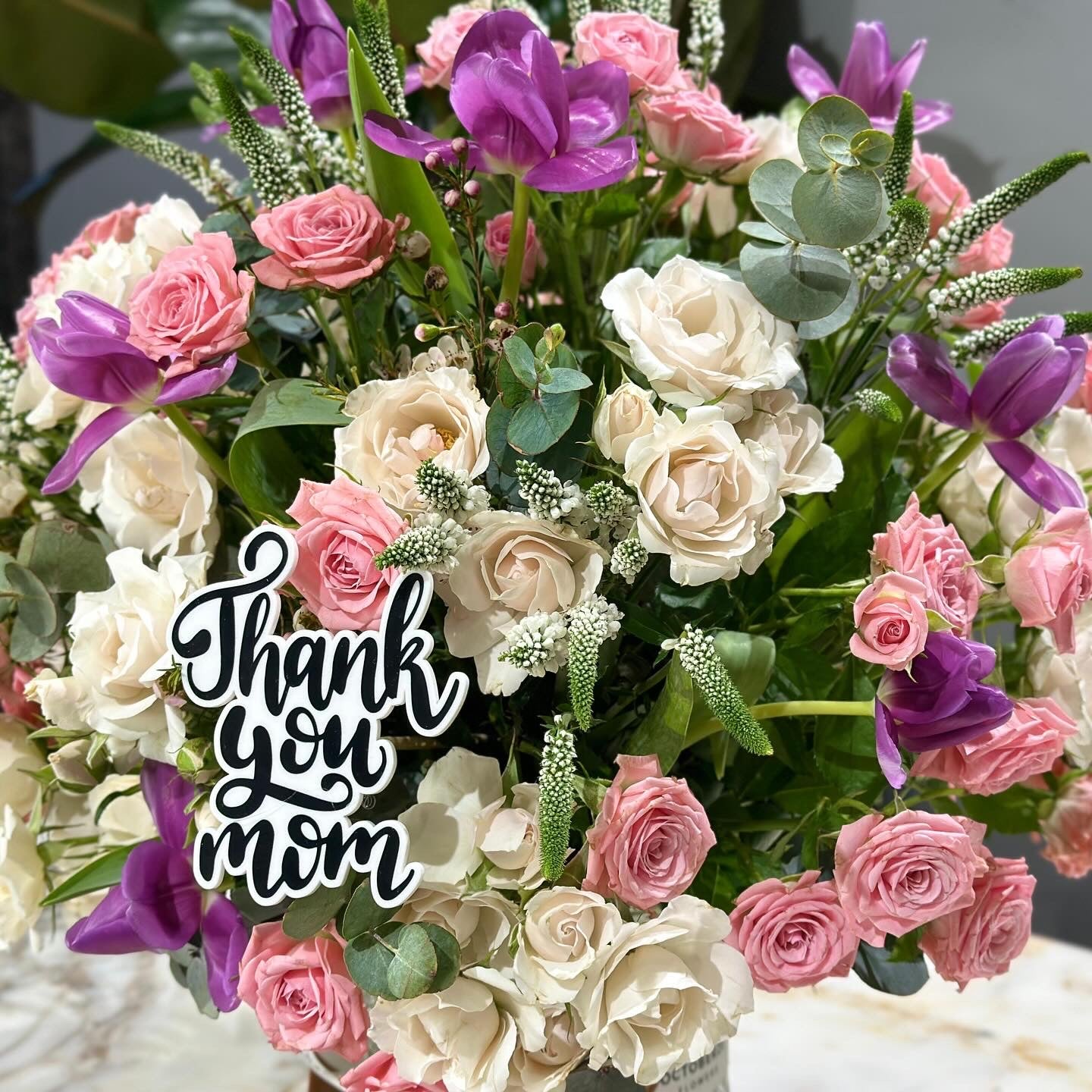 This vase contains baby roses, tulips, veronica and eucalyptus.